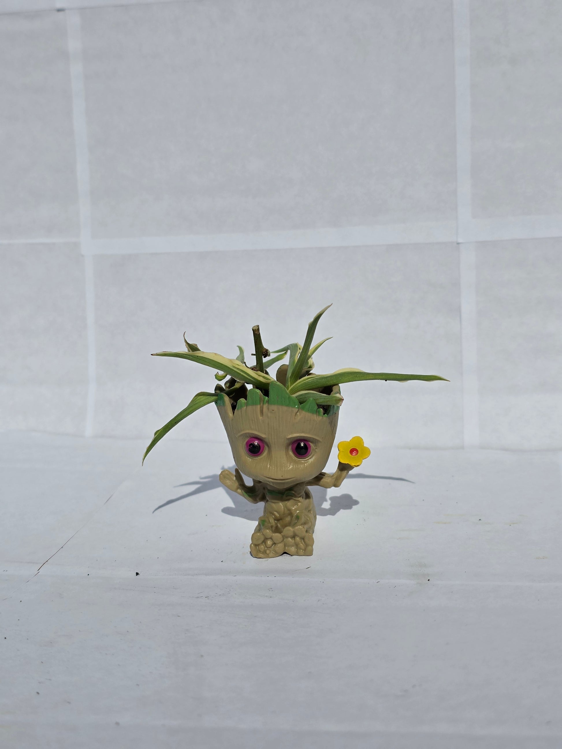 Ez a rendkívül menő kaspó a Marvel univerzum rajongóinak készült! A népszerű Baby Groot karaktert ábrázolja, kezében egy apró sárga virággal, ami a filmekből jól ismert kedves megjelenését idézi. A "Groot fejéből" kinövő zöld-fehér csíkos levelű növény (valószínűleg egy fiatal Pókpálma, más néven Pókfű vagy Chlorophytum comosum) teszi teljessé a vicces és egyedi megjelenést.