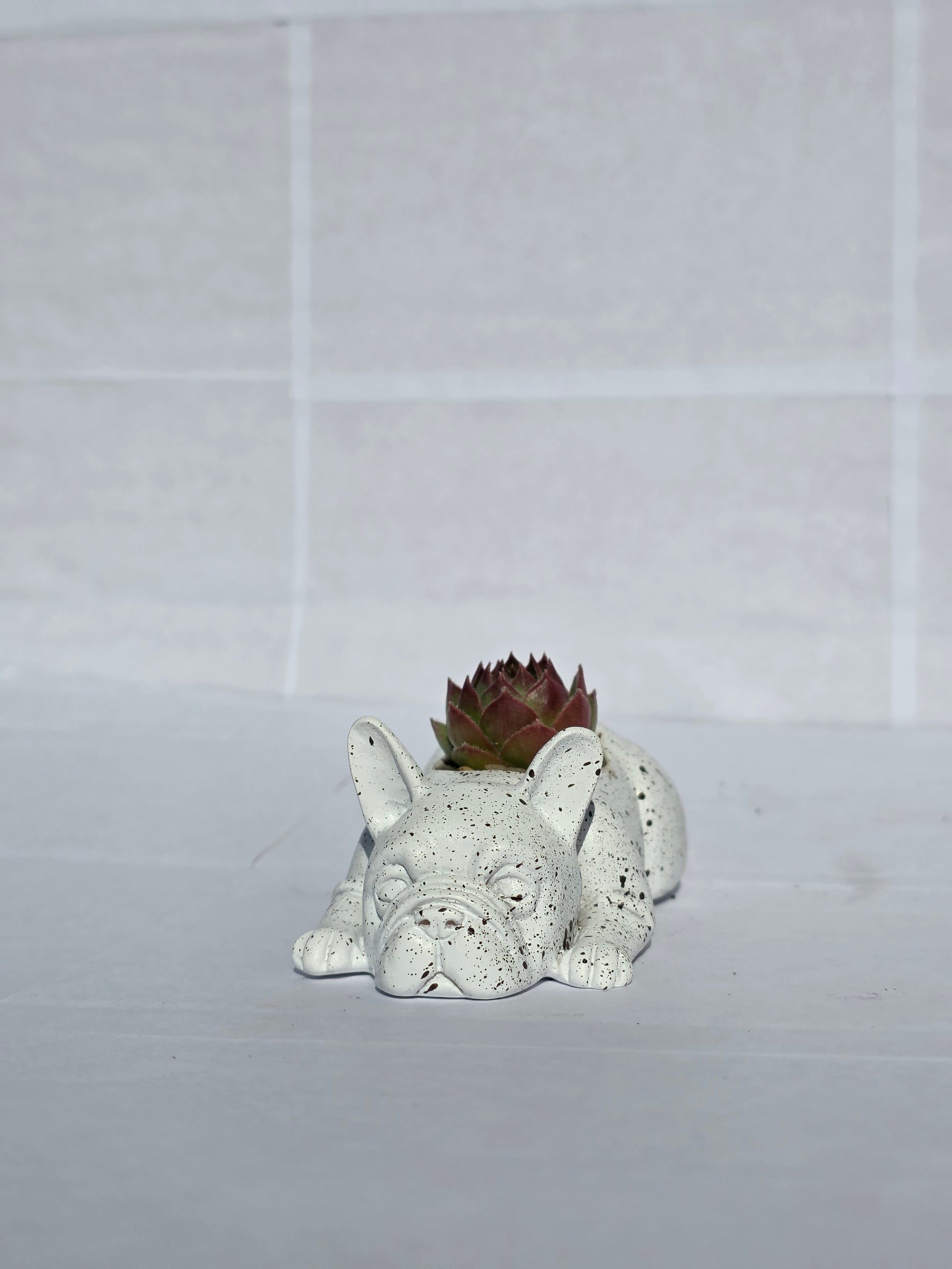 Termékleírás: Hanyagul Elnyúló Francia Bulldog Virágtartó Kövirózsával