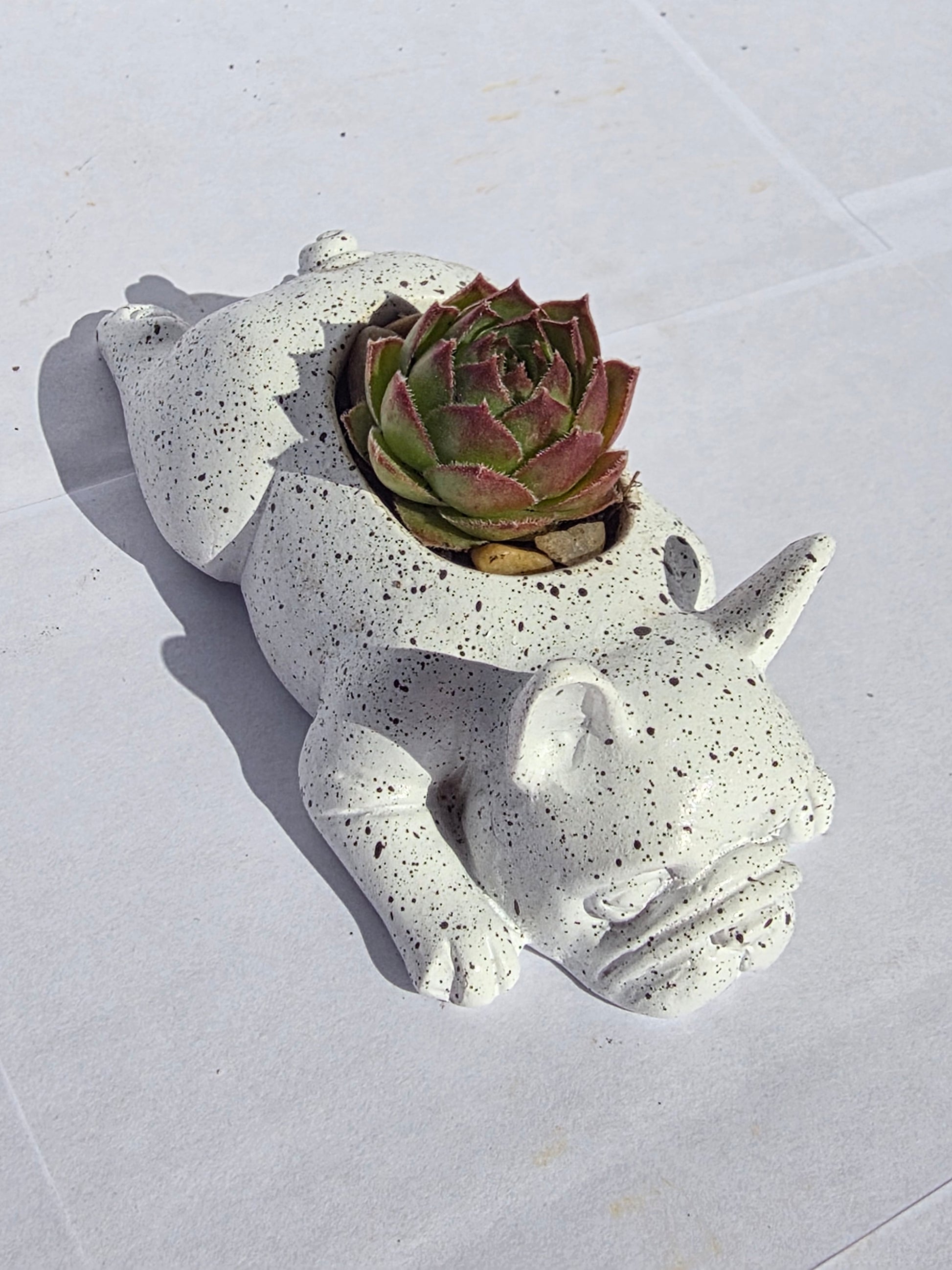 A bájosan lusta pihenő pózban lévő, fülledt francia bulldog mintájú virágtartó azonnal otthonossá és vidámmá tesz minden környezetet. A tökéletes ajándék a fajta szerelmeseinek, vagy bárkinek, aki szereti az egyedi és igénytelen növénydekorációt!