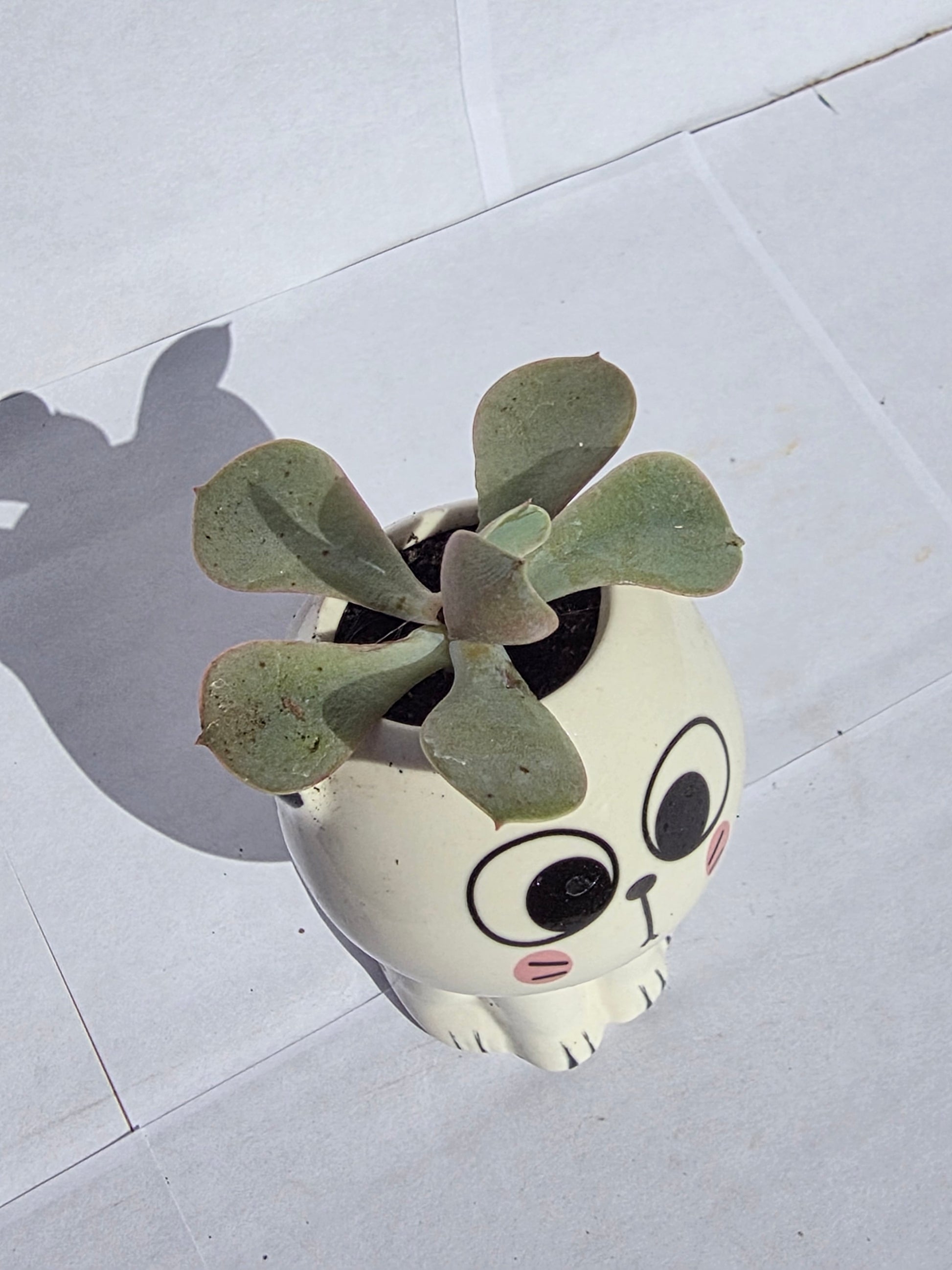 Növény: Egy kisméretű, húsos levelű Echeveria vagy más pozsgás növény (valószínűleg a levelek formája alapján egy Pachyphytum vagy Graptopetalum hibrid). Levelei matt zöldes-szürkék, enyhén vöröses árnyalattal.