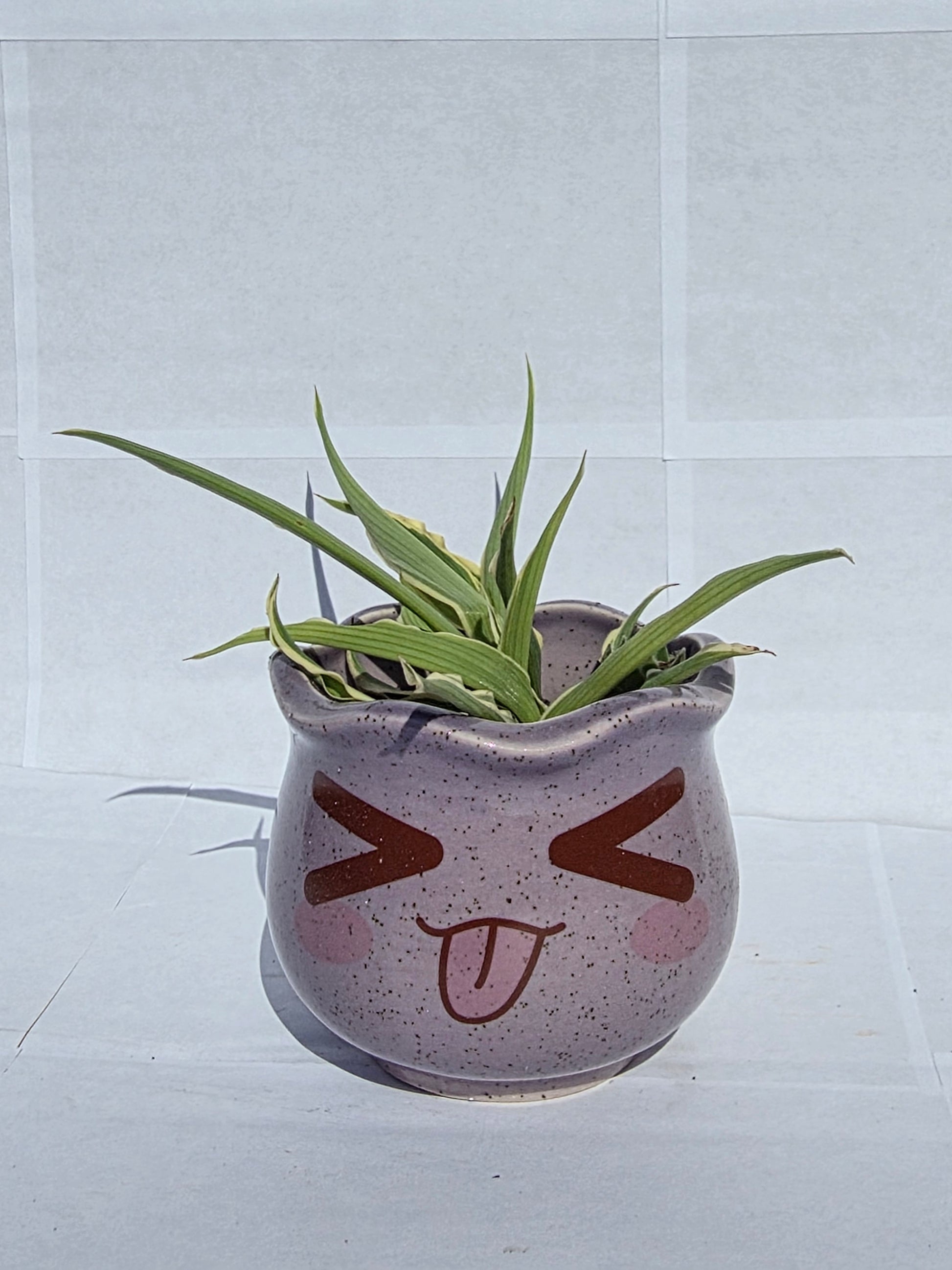 Ez a mini kerámia kaspó a SzuziVirág legvidámabb darabjai közé tartozik! A trendi lilás-szürke, finoman pettyezett máz és a nagy, játékos, nyelvet öltő arc (emoji-stílusú) teszi ezt a darabot azonnal szerethetővé és modernné.