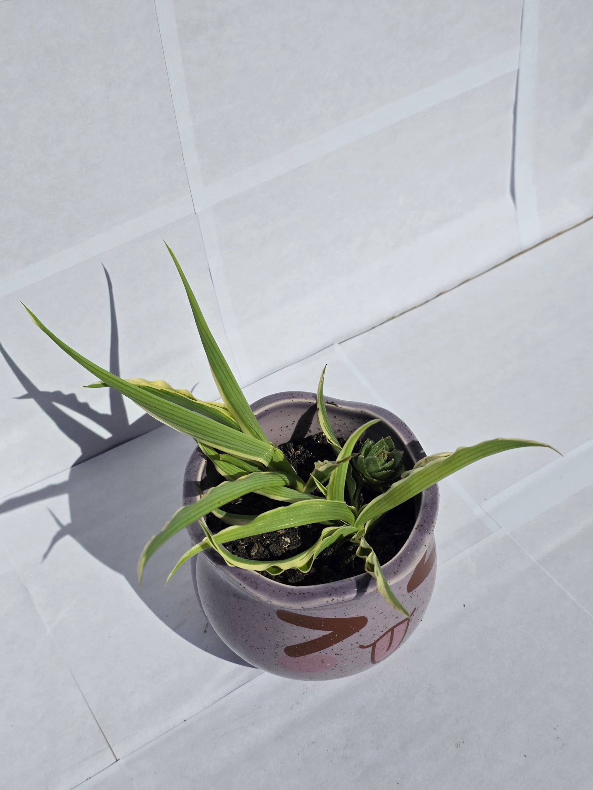 A beültetett növény egy könnyen gondozható, csíkos levelű pozsgás (például egy fiatal, variegát levelű Pókpálma vagy hasonló). A felfelé törő, íves levelek tökéletesen utánozzák a „huncut” frizurát, ami remekül kiegészíti a kaspó karakterét.