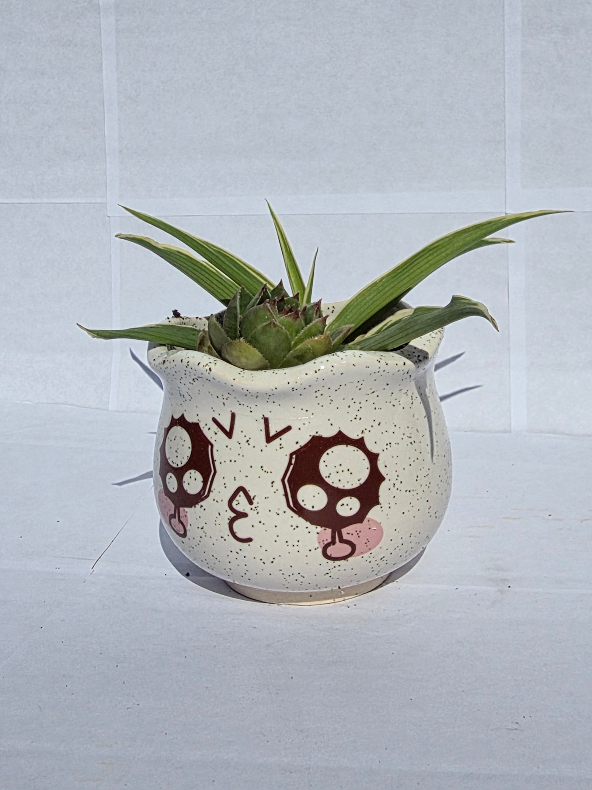 Ez a mini kerámia kaspó igazi karaktert csempész otthonába. A krémszínű, apró barna pettyekkel borított kaspó elejét egy rendkívül játékos, manga stílusú arc díszíti: a pislogó (vagy szemérmes) szemek és a kacér száj remek hangulatot kölcsönöznek a kompozíciónak.