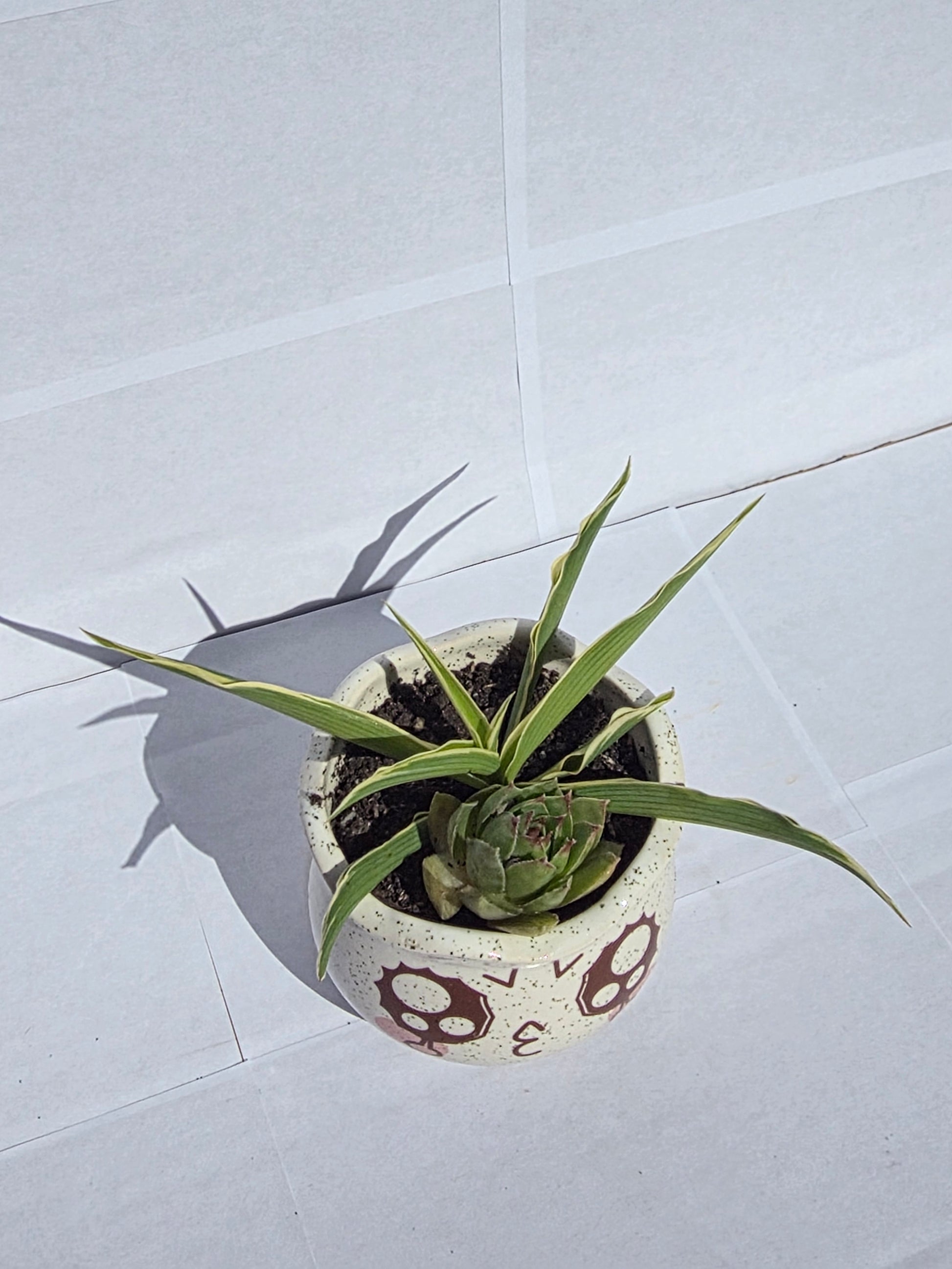 A kaspó tartalma kétféle, könnyen gondozható pozsgás növényt ötvöz, amelyek textúrájukkal és formájukkal ellensúlyozzák egymást: