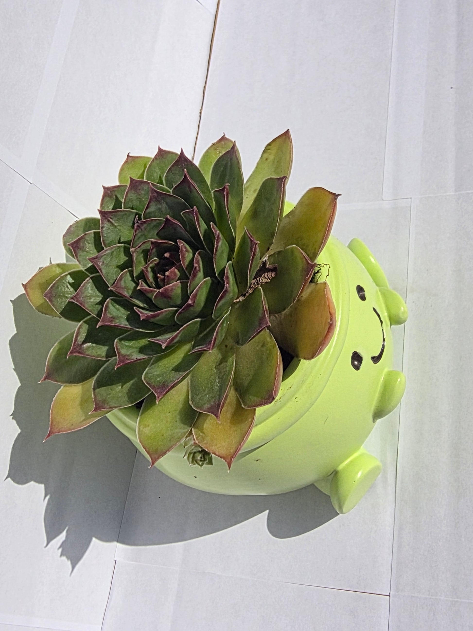 A kaspóban egy ellenálló és dekoratív Kövirózsa (Sempervivum) kapott helyet. Ennek a fajtának a zöld levelei gyönyörű, borvörös vagy mélybordó végekkel és középpel díszítettek, melyek a megfelelő napfény hatására még intenzívebbé válnak.