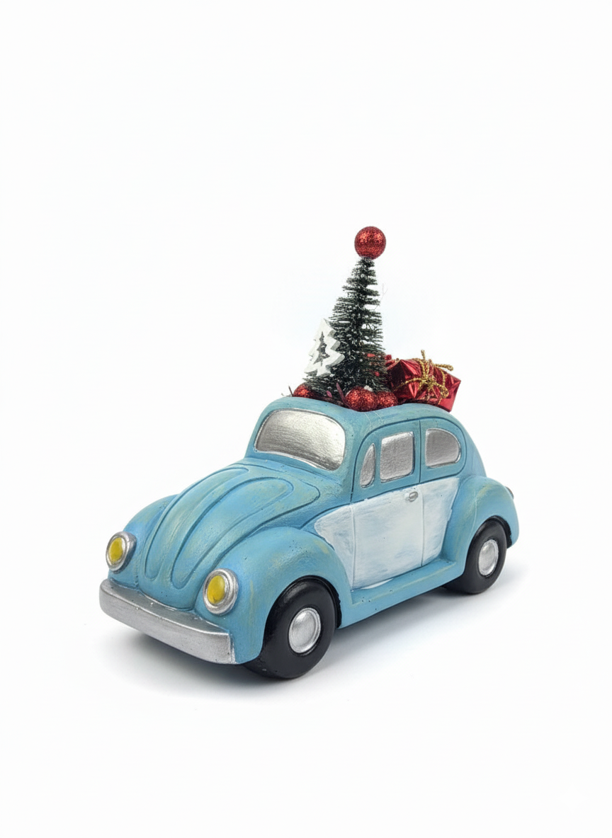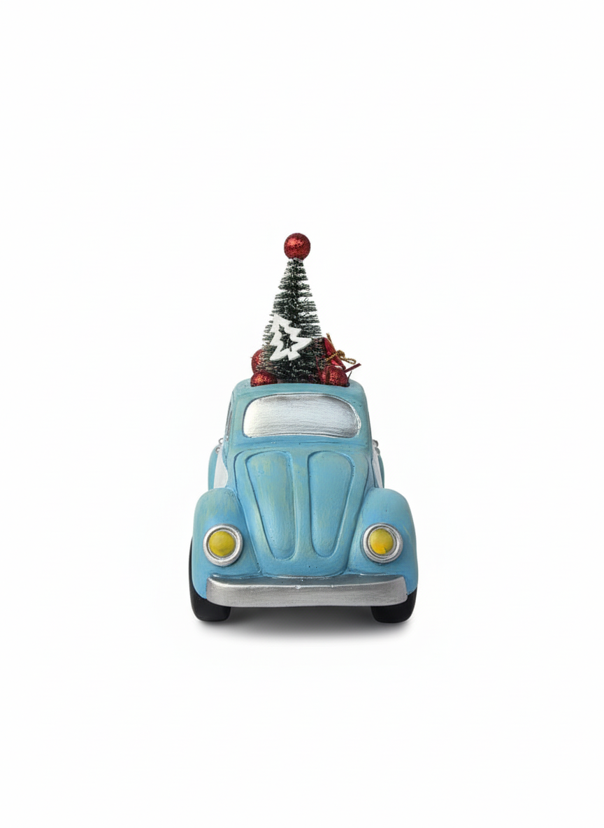 Ez a bájos vintage stílusú kék bogárhátú autó tökéletes kiegészítője az ünnepi dekorációnak. A részletes kidolgozású kerámia figura tetején egy csillogó karácsonyfa és apró piros díszek találhatók, mintha éppen a tökéletes fenyőfát szállítaná haza az ünnepekre. Ideális dísz az ablakpárkányra, kandallóra vagy akár az íróasztalra, melegséget és nosztalgikus hangulatot varázsolva otthonodba. Kiváló ajándék lehet autórajongóknak és mindazoknak, akik szeretik az egyedi, különleges karácsonyi díszeket.